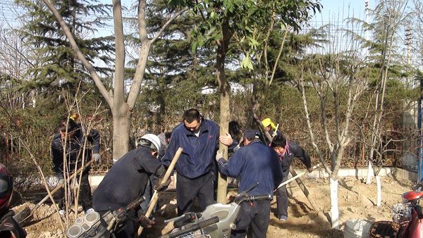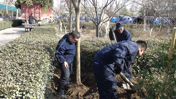 每年一度的“3月12日植樹節”在山東淄博太極搪玻璃設備公司年年都過。由于全國各地廣大用戶對太極搪玻璃反應釜等搪玻璃設備的需求越來越大,所以生產進度絕對不能耽誤,車間工人這天都會緊鑼密鼓的努力生產工作,所以植樹種花美化太極家園的任務則由公司辦公后勤人員來完成,在領導的分工安排下,吊卸組、修剪組、轉運組、挖坑組、種植組、支架組、澆灌組等分工明確、井然有序大家一同努力來把太極家園美化。
