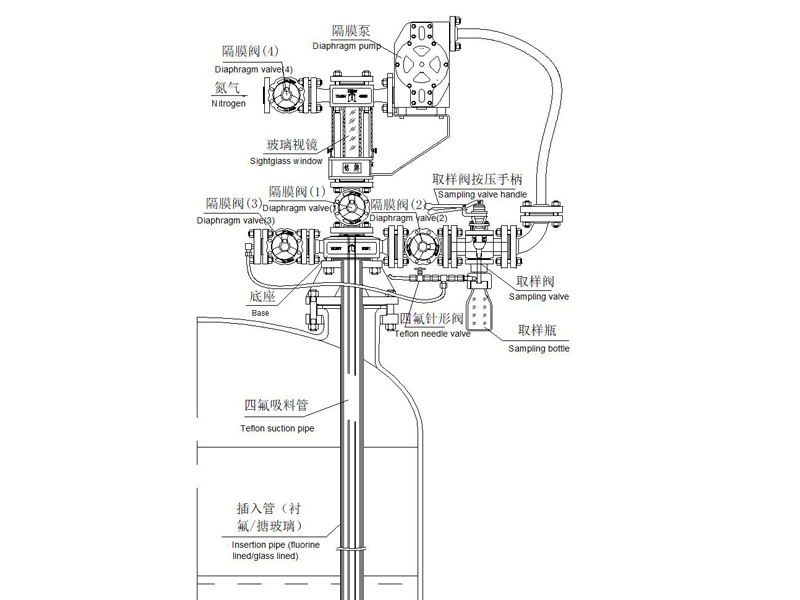 太極反應釜在線自動取樣系統(tǒng)(AUTOMATIC SAMPLING SYSTEM)為防腐在線取樣裝置。取樣物料接觸各部件均采用里襯PFA、襯氟材質,達到防腐目的;四氟吸料管配套插入管(襯氟/搪玻璃材質)浸于釜內料液以下,增加其過程的穩(wěn)定性。隔膜泵以潔凈壓縮空氣為動力,物料在取樣系統(tǒng)中形成閉環(huán)循環(huán)回路,過程快捷、安全、無污染。